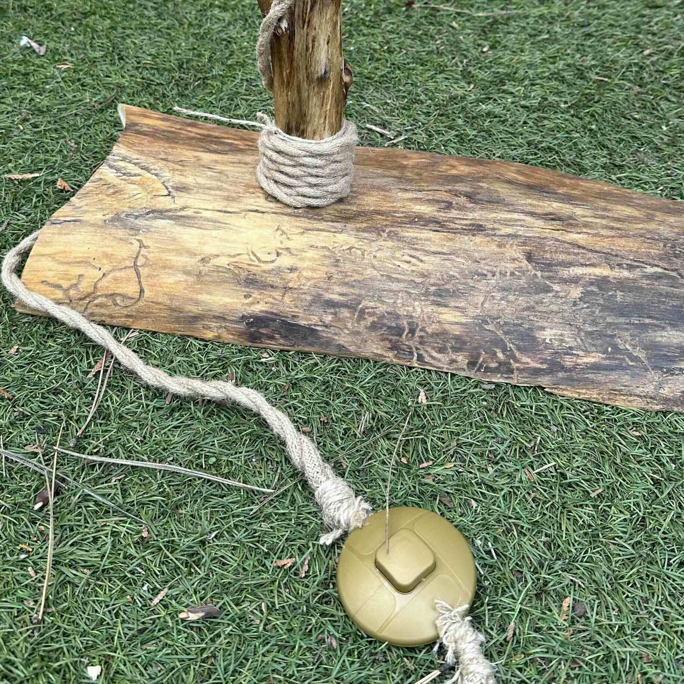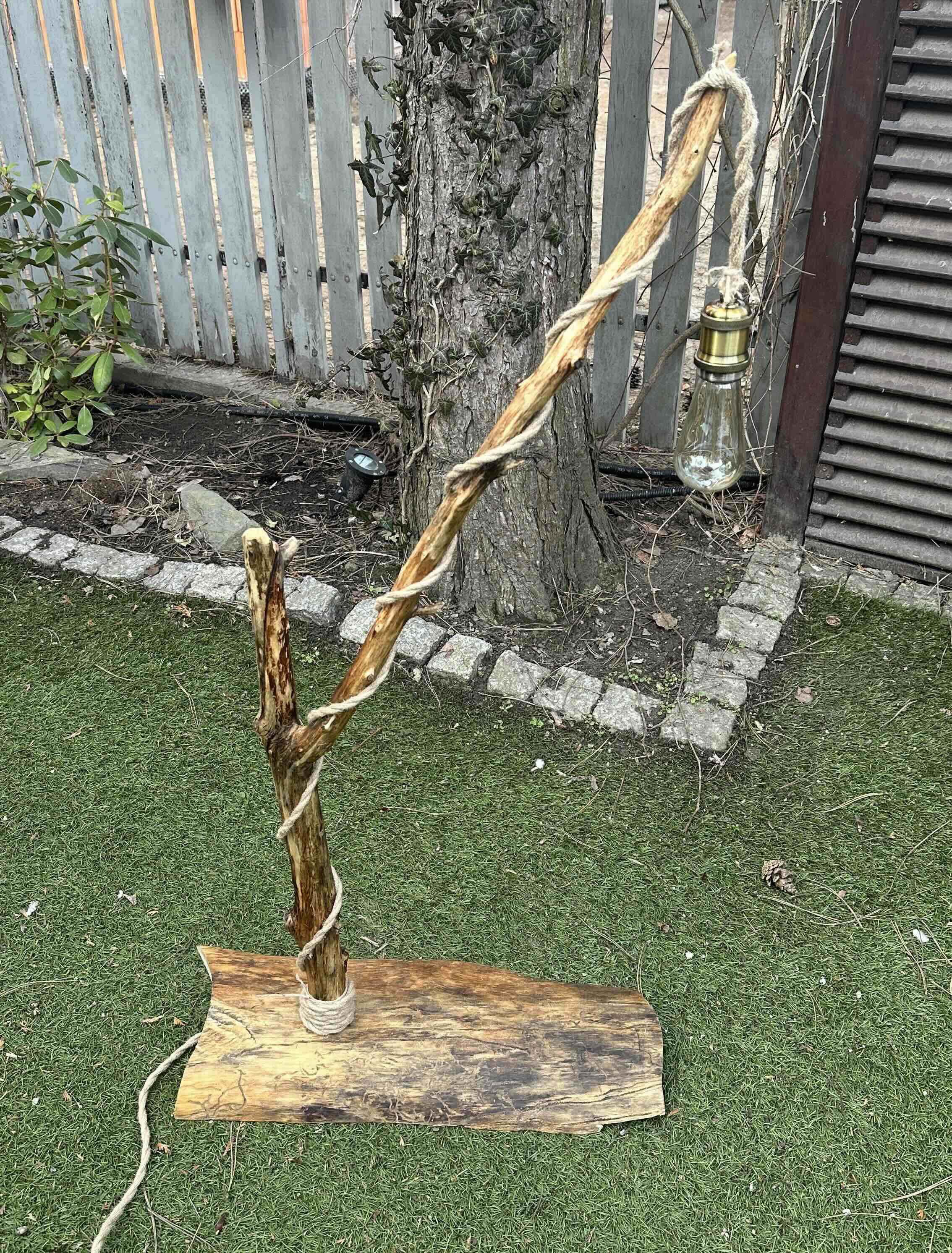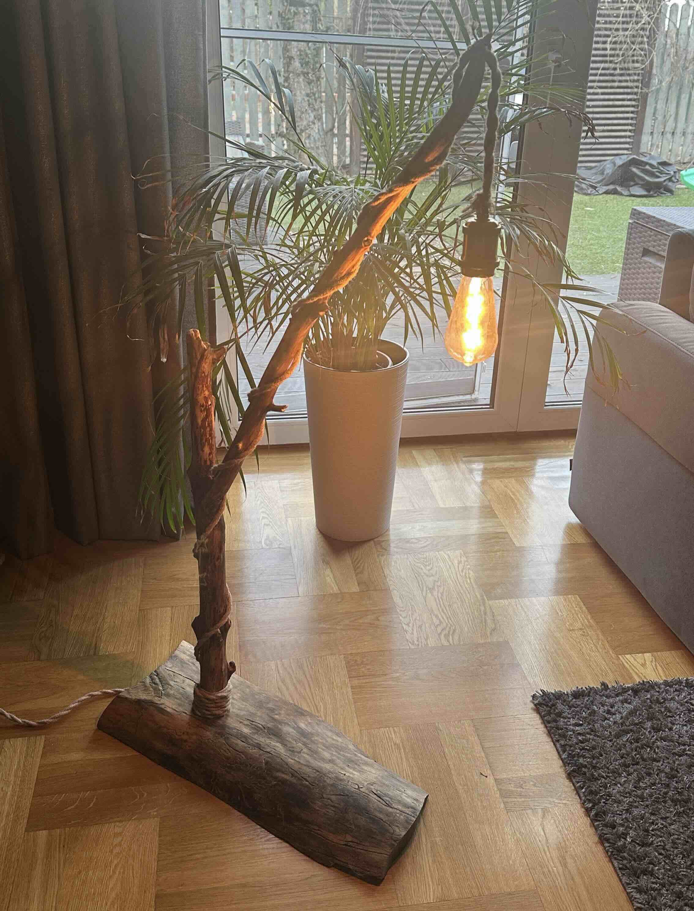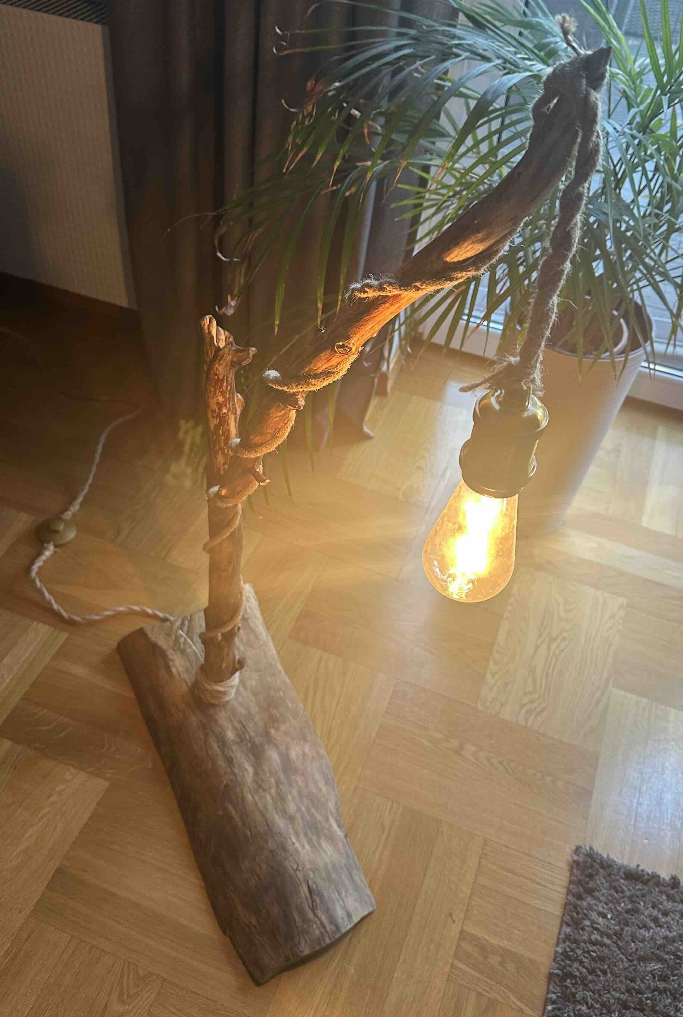 Przewód elektryczny został starannie owinięty naturalnym sznurem, co dodatkowo podkreśla rękodzielniczy charakter lampy i nadaje jej wyjątkowego, rustykalnego wyglądu. Całość została zabezpieczona naturalnym olejem lnianym, który chroni drewno i wydobywa jego naturalne piękno.
